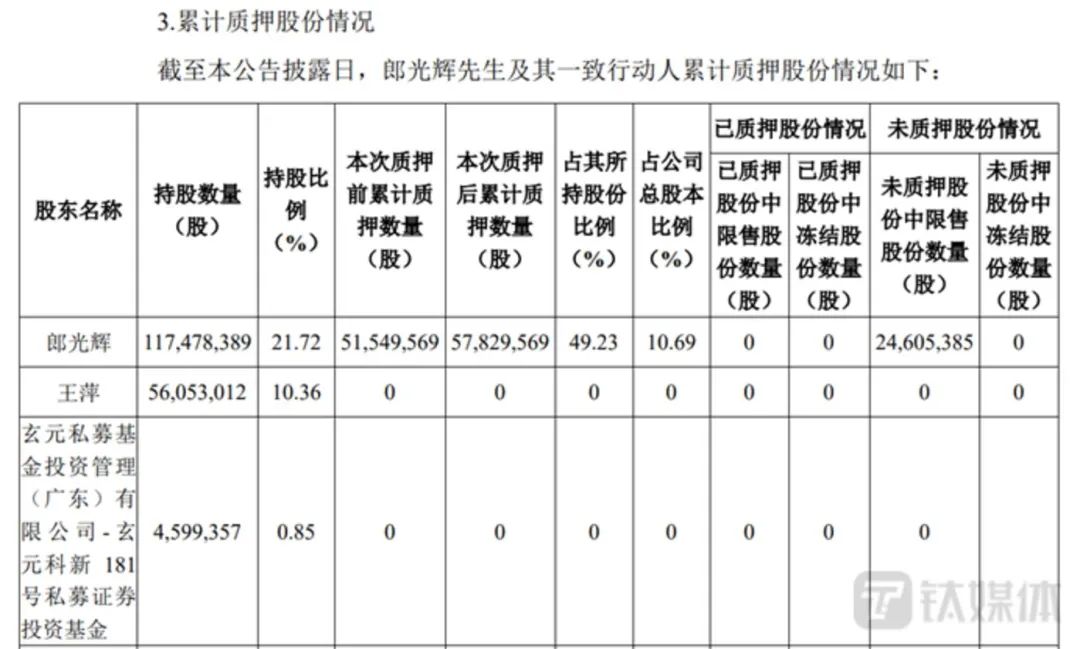 而钛媒体APP注意到,在此期间郎光辉个人质押比例达到35%,据公司今年5月10日公告,郎光辉持有股份累计质押数量已达到5782.95万股,占其所持本公司股份的49.23%,占本公司总股本的10.69%。