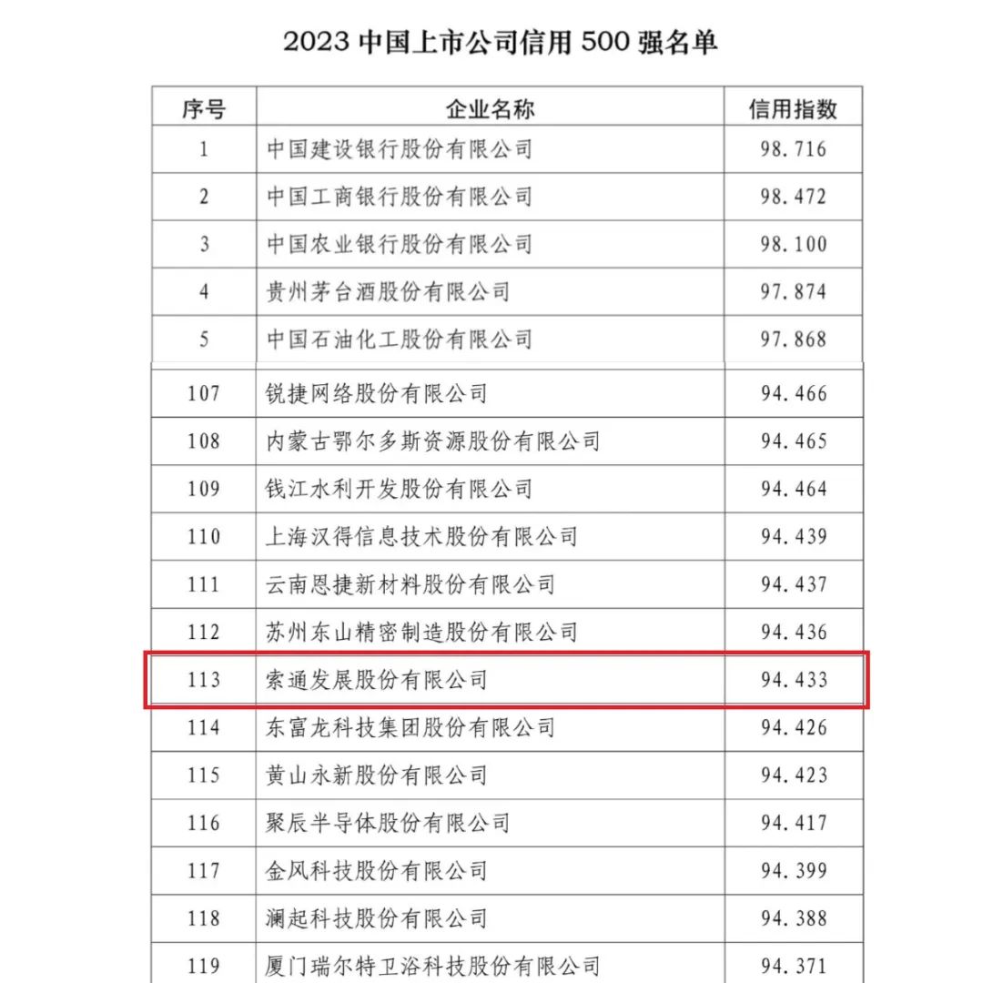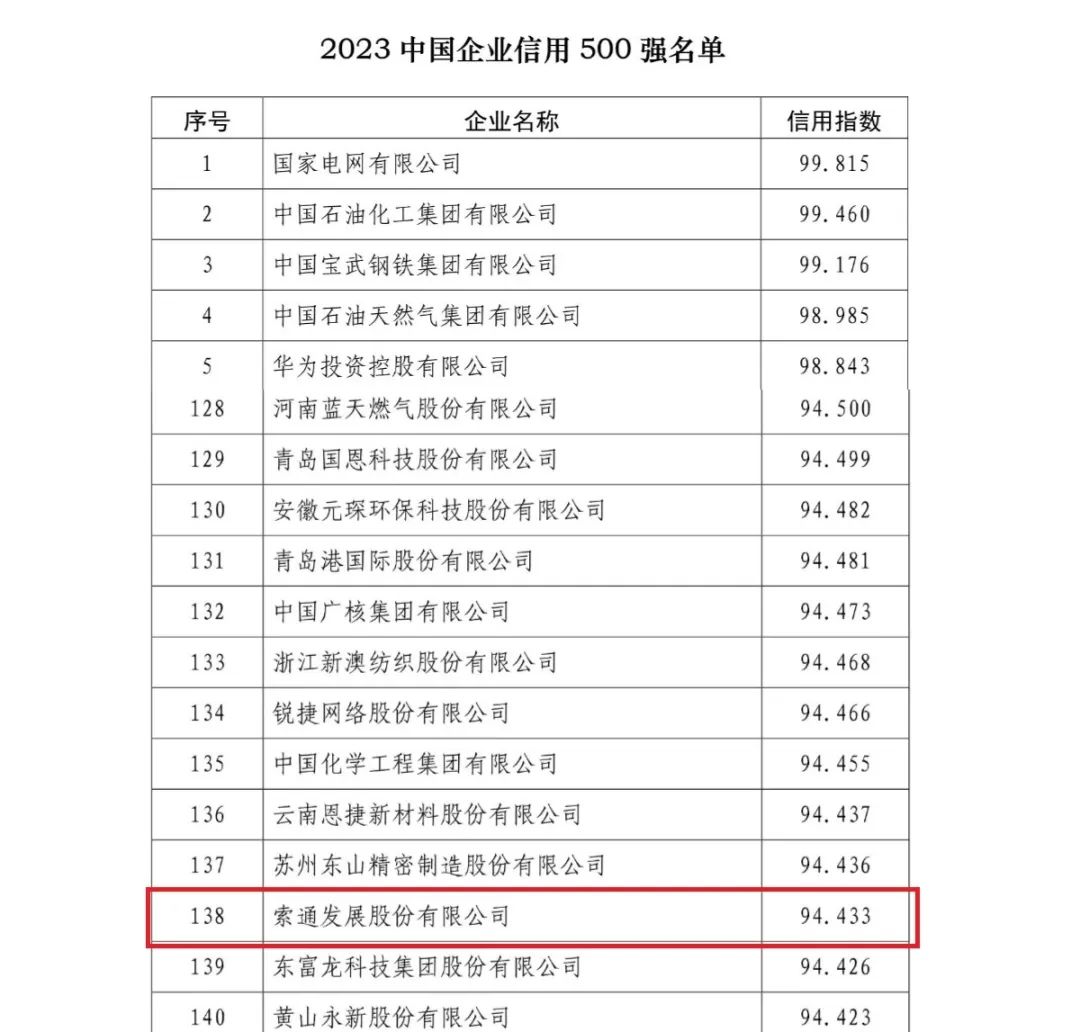 论坛发布了2023年度中国企业信用500强系列榜单,索通发展荣登“2023年度中国企业信用500强”、“中国上市公司信用500强”,分别位列138位、113位。