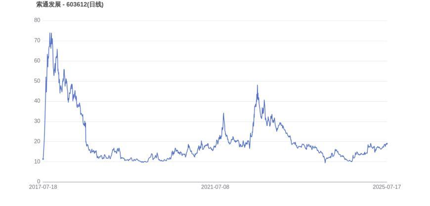 从上市首日至今,索通发展的市值实现了2.46倍的增长,显示出一定的成长性。2022年7月18日,索通发展的市值巅峰达到230.43亿元,股价也顺应升至50.1元。而至7月17日收盘,索通发展的股价为18.98元,市值为94.54亿元,相比峰值时期市值减少135.89亿元,市值蒸发了58.97%。