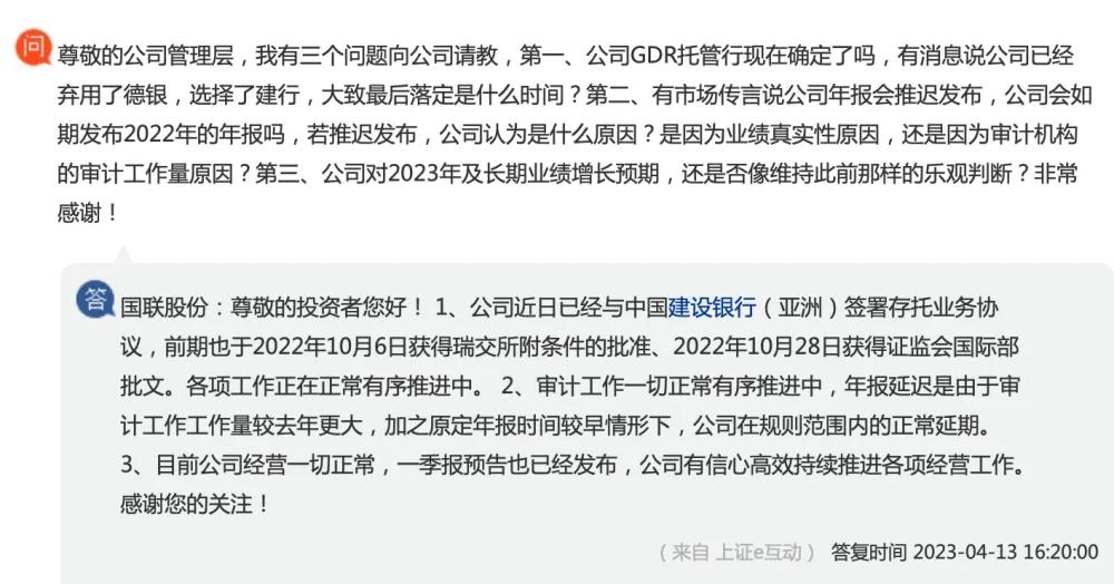 对此国联股份董秘回复称,“审计工作一切正常有序推进中,年报延迟是由于审计工作工作量较去年更大,加之原定年报时间较早情形下,公司在规则范围内的正常延期。”