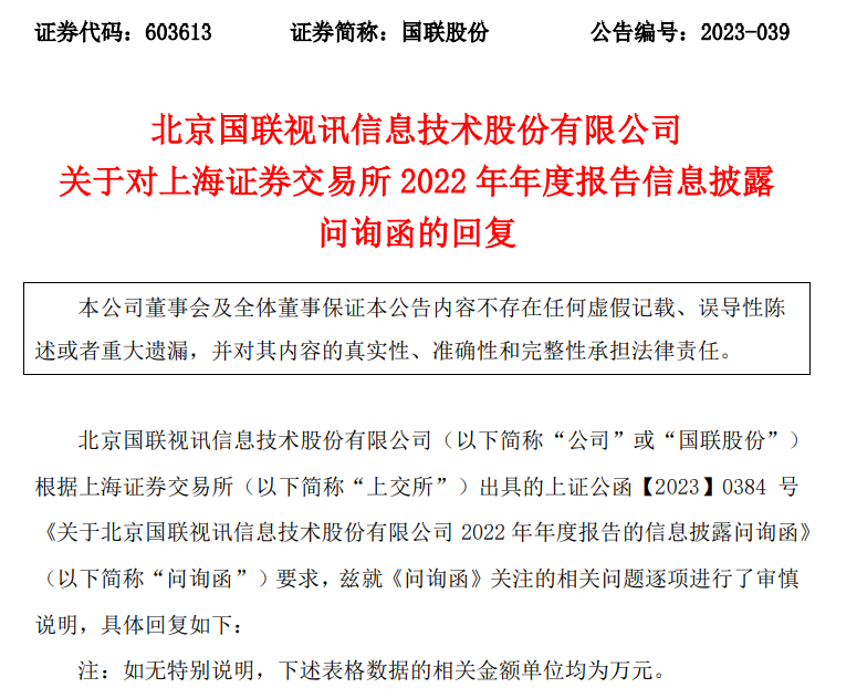 2022 年 11 月,上海证券交易所出具上证公函[2022]2678 号《关于北京国联视讯信息技术股份有限公司有关媒体报道事项的问询函》,针对媒体报道中涉及的融资性贸易、募集资金使用、预收预付款项以及人均创收异常等事项进行问询。