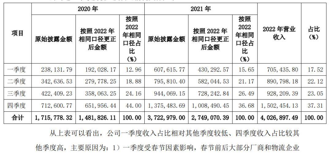 会停工、停产,销售减少,所以一季度相对收入较少;2)第四季度收入较高主要是双十电商节积累的大量订单一般于本季度实现交付,另外,年末部分行业需要为次年备货,如农资行业为春耕备货,部分客户也会提前采购备货(部分工厂和物流春节假期,因此会提前备货)等。因而,每年四季度收入会相较前三个季度高,符合行业规律及商业逻辑。