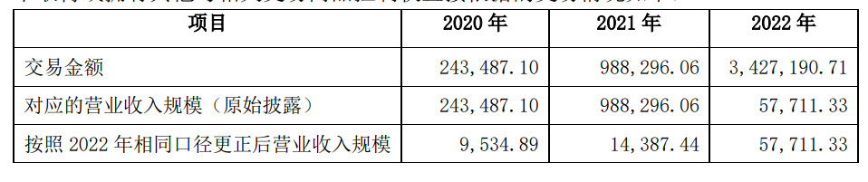 (二)请公司补充披露实际收入与预告值差异较大是否系因部分交易由总额法调整为净额法公司一直以取得客户的签收单作为 B2B 网上商品交易确认收入的依据。2022 年度实际收入与预告值差异较大系:2022 年编制年报时,公司对 B2B 网上商品交易的相关证据留存情况进行了重新梳理,按照更加严谨的标准,公司对于难以完整取得或拥有除客户签收单以外的与交易相关商品控制权直接相关的其他证据的交易,采用净额法确认营业收入,该部分对应的交易成本额为 336.95 亿元,按照净额法确认的营业收入为 5.77 亿元。