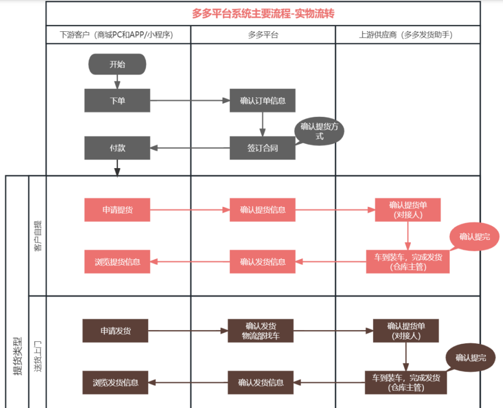 存在物理空间移动是指公司交付的下游客户需要进行实际货物提取,依据客户的具体提货类型划分为客户自提、供应商直发和多多物流配送三种。具体的交易流程如下:
