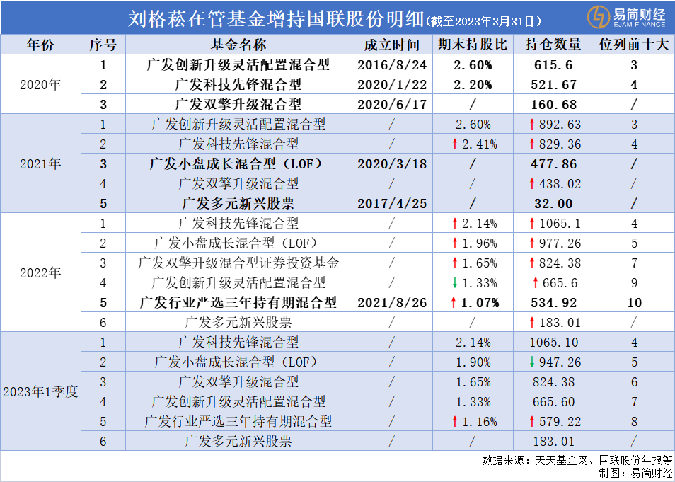 2023年一季度,刘格菘继续持有国联股份。其中明显的变化是,广发行业严选三年持有期混合型增加44万股,广发小盘成长混合型(LOF)减少了30万股。