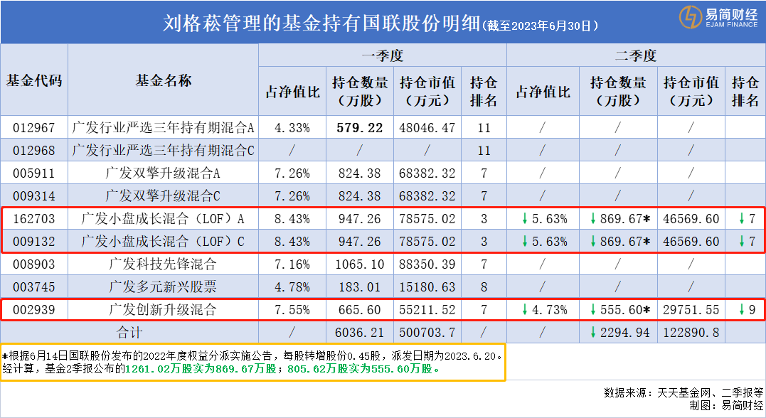 但是,广发小盘成长混合和广发创新升级混合仍然重仓国联股份,根据6月14日国联股份发布的权益分派公告,经计算,刘格菘仍然持有国联股份合计2294.22万股,转增之后达到3327.66万股,市值约12亿元。