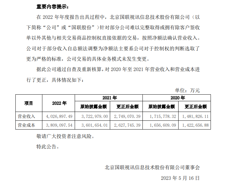 但此后,国联股份在信披问题上“打脸”。2023年5月16日,该公司发布2020年至2021年财务数据更正公告,称2022年年报告出具过程中,针对部分公司难以完整取得或拥有除客户签收单以外其他与相关交易商品控制权直接依据的交易,按照净额法确认营业收入。对部分收入自总额法调整为净额法,主要系公司对控制权的判断选取了更为严格的标准,但交易的具体业务模式未发生变更。
