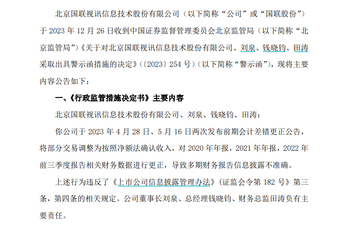 国联股份还公告称,公司及公司董事长刘泉、总经理钱晓钧、财务总监田涛被北京证监局出具警示函。原因是,公司于2023年4月28日、5月16日两次发布前期会计差错更正公告,将部分交易调整为按照净额法确认收入,对2020年年报,2021年年报,以及2022年前三季度报告相关财务数据进行更正,导致多期财务报告信息披露不准确,违反了《上市公司信息披露管理办法》相关规定。