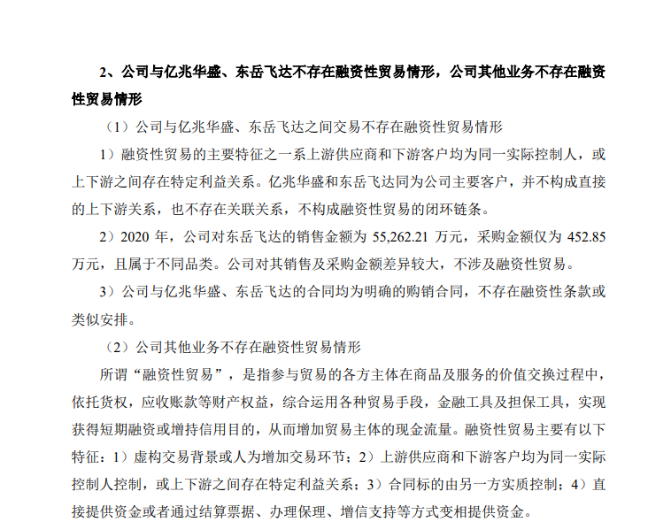 2022年12月1日,国联股份回复上交所问询函称,媒体报道所述融资性贸易、人均创收异常、募集资金使用等事项不属实,前期相关信息披露真实、准确、完整。国联股份还表示,公司与亿兆华盛、东岳飞达不存在融资性贸易情形,公司其他业务不存在融资性贸易情形,并否认存在募集资金违规使用情况。