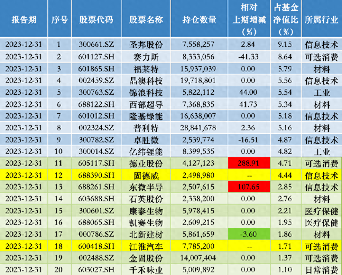值得一提的是,固德威与江淮汽车均为此次新进标的,所占基金净值比例分别为4.44%、1.71%,依次位列第十二、第十八大重仓股。