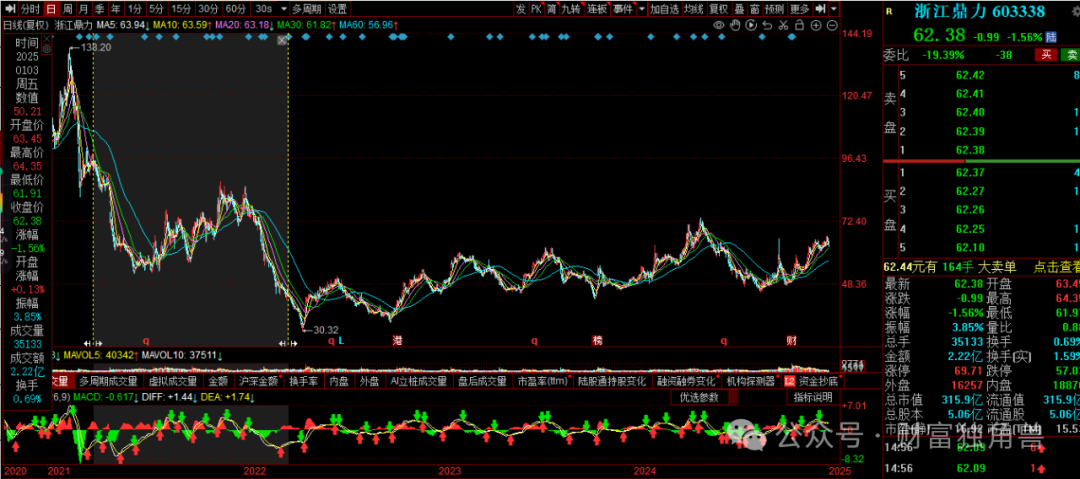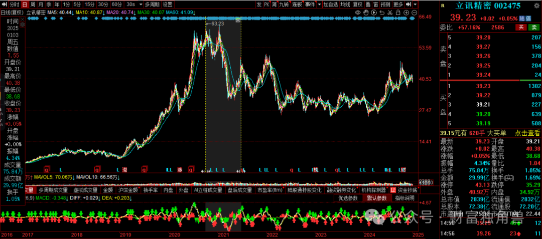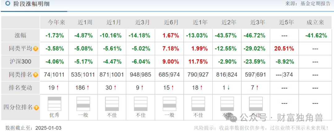 笔者发现,该基金在2020年4季度持有85.42万股的立讯精密,2021年1季度持有221.46万股,到了2021年2季度已经没有了此前购买的股票。然而,在该基金持有期间,2020年10月8日-2021年6月30日股票价格下跌了20%。不过,2024年2季度又持有了38.66万股,2024年3季度持有32.83万股,目前不清楚2024年4季度是否还持有份额。但这轮收益不错,2024年4月1日-2025年1月3日股票价格上涨了34%。