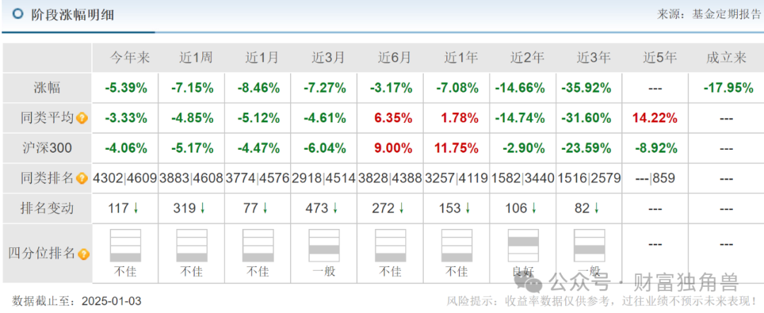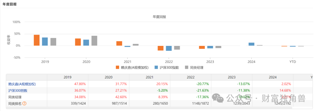 从2023年开始差距就逐渐开始拉大,2023年年度回报-13.07%,沪深300指数-11.38%,同类经理-10.02%,同类排名1239/2043。2024年年度回报也有差距,赖庆鑫年度回报降至2.02%,沪深300指数回报率却涨至14.68%,同类经理3.27%,同类排名进一步下降至1245/2192。