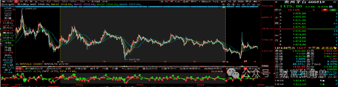 笔者还发现,该基金在2021年4季度开始长期持有贵州茅台,这个季度买入1.31万股的贵州茅台,2022年1季度持有3.09万股,2022年2季度持有2.68万股,2022年3季度持有2.40万股,2022年 4季度持有2.49万股。2023年1季度持有1.92万股,2023年2季度持有2.19万股,2023年3季度持有1.97万股,2023年4季度持有2.50万股。2024年1季度持有1.03万股,到了2024年2季度已经没有了此前所购买的股票。然而,在这期间,2021年10月9日-2024年6月30日股票价格下跌了14%。