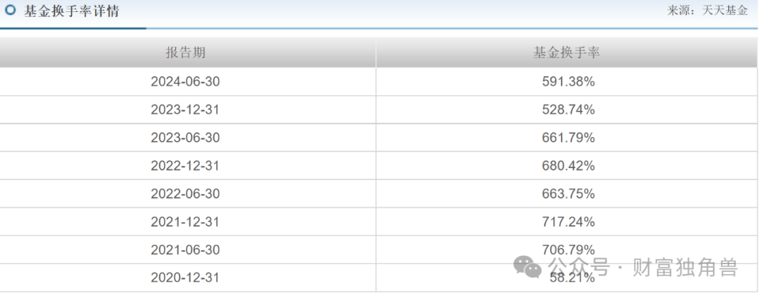 基金业绩亏损,笔者翻看换手率发现,该基金换手率极高,换手率最低的也是在2020年4季度换手率58.21%,后面的几个季度换手率都在100%以上,2021年4季度最高,高达717.24%;2022年4季度还高达680.42%;即使是最新的一季,其换手率也高达591.38%。