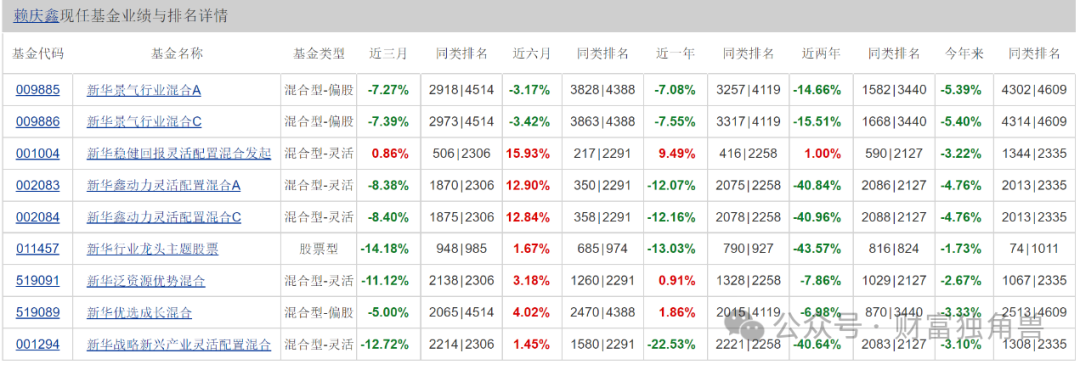 据天天基金网显示,目前赖庆鑫在管基金7只基金,但笔者发现,赖庆鑫旗下基金业绩并不理想,今年来有7只基金出现亏损。近3月来也有6只基金亏损,其中新华行业龙头主题股票基金,其收益率-14.18%;近2年来也有6只基金出现亏损,其中亏损最大的仍是新华行业龙头主题股票基金,其收益率-43.57%。