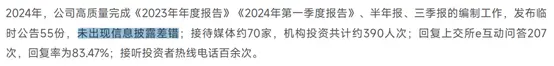 2024年,公司高质量完成《2023年年度报告》《2024年第一季度报告》、半年报、三季报的编制工作,发布临时公告55份,未出现信息披露差错。