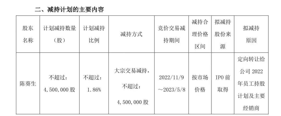 11月2日,茶花股份发布公告称,公司实际控制人之一、董事长陈葵生计划自本公告披露之日起3个交易日后的6个月内,通过大宗交易方式向公司 2022 年员工持股计划及主要经销商转让公司股份不超过 4,500,000 股,即不超过公司总股本的 1.86%,并且除公司2022 年员工持股计划及主要经销商外,不向第三方减持股份。