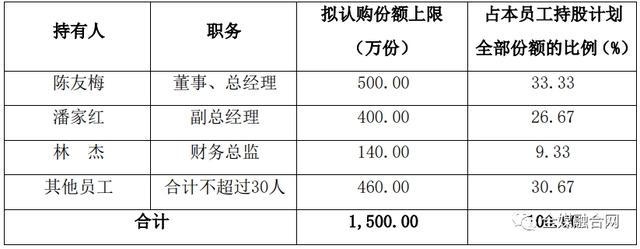 员工持股计划显示,该员工持股计划拟筹集资金总额不超过1500万元,每份份额为1元,该员工持股计划的份数上限为1500万份。该员工持股计划的参加对象为公司的董事、高级管理人员及各个岗位骨干员工,参加对象在公司或者子公司工作、领取薪酬,并与公司或子公司签订劳动合同或聘用合同等确定用工关系的合同或者协议,总人数预计不超过33人,其中公司董事、高级管理人员共计3人。