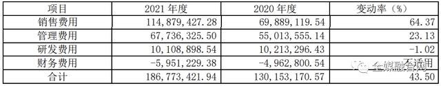 年报显示,2021年,四项期间费用合计1.87亿元,与上年同期合计数1.3亿元相比上涨 43.5%。其中,销售费用1.15亿元,上年同期为6988.91万元,同比增长64.37%。