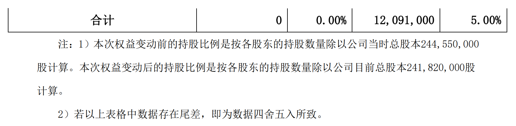 公告显示,茶花股份实际控制人之一陈冠宇此次通过协议转让方式减持公司股份12,091,000股;以及2021年至2022年期间陈明生通过大宗交易方式减持公司股份4,088,000股,陈葵生通过大宗交易方式减持公司股份3,972,000股及因公司部分限制性股票回购注销导致公司实际控制人及其一致行动人的持股比例被动增加。