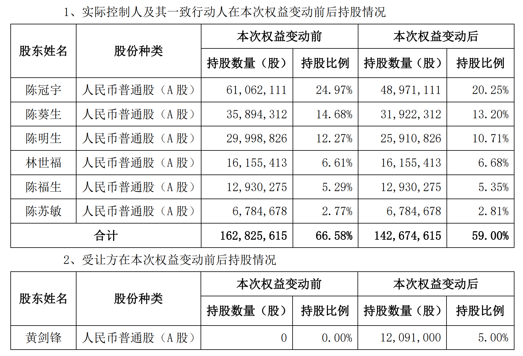 本次权益变动后,公司实际控制人之一陈冠宇持有公司股份48,971,111股,占公司目前总股本(241,820,000股)的20.25%,公司实际控制人及其一致行动人合计持有公司股份142,674,615股,占公司目前总股本(241,820,000股)的59.00%。
