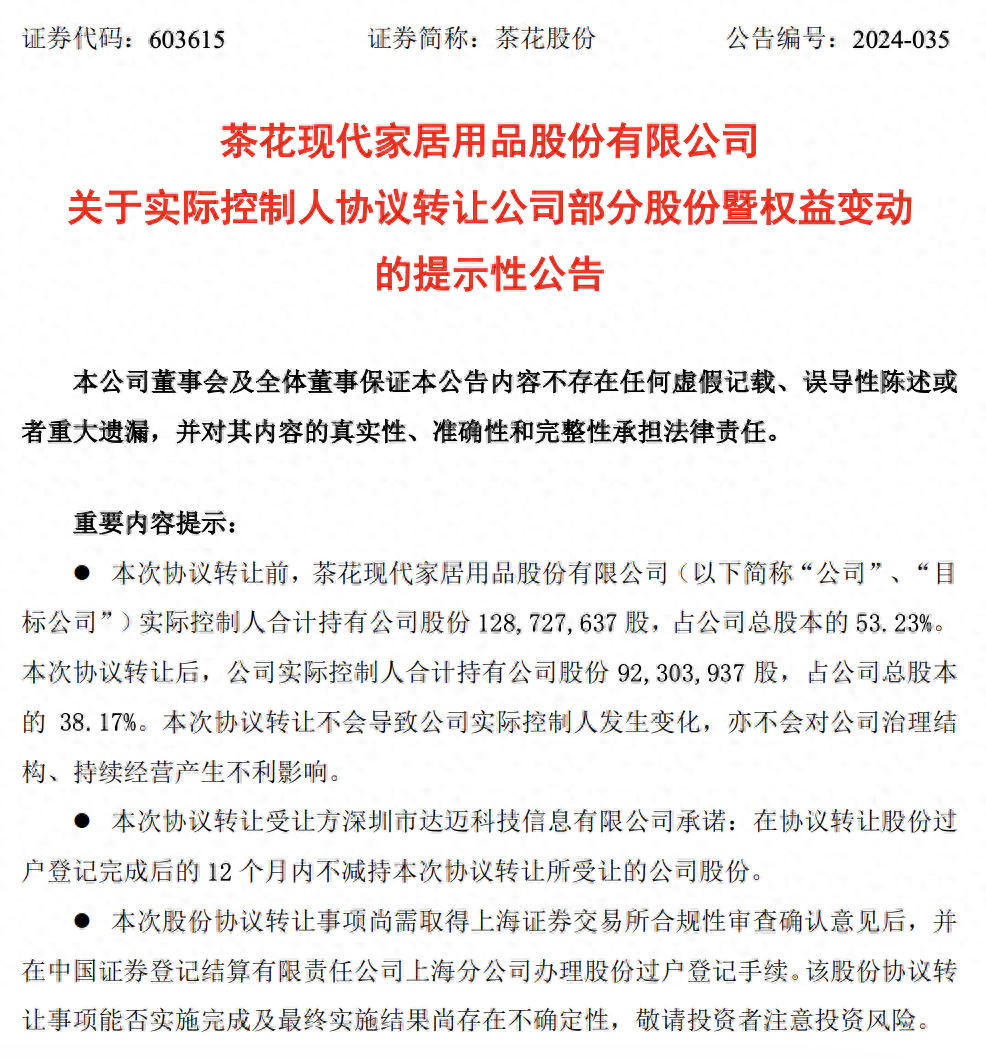 11月20日,知名日用家居企业茶花股份突然发布了一份减持公告。根据该公告内容显示,公司实际控制人陈氏家族(陈冠宇、陈葵生、陈福生、林世福)拟通过协议转让方式向达迈科技合计转让3600万股,占到公司总股本的15.06%,合计套现6.77亿元,减持价格为当日收盘价的8折左右。