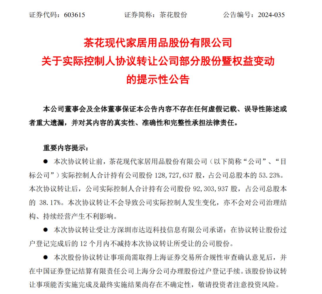11月21日,茶花现代家居用品股份有限公司(以下简称“茶花股份”)发布公告称,公司实际控制人陈冠宇、陈葵生、陈福生、林世福拟通过协议转让方式分别将其所持有的公司股份合计3642.37万股,占公司总股本的15.06%,以18.60元/股的价格转让给受让方深圳市达迈科技信息有限公司(以下简称“达迈科技”),转让价款合计6.77亿元。