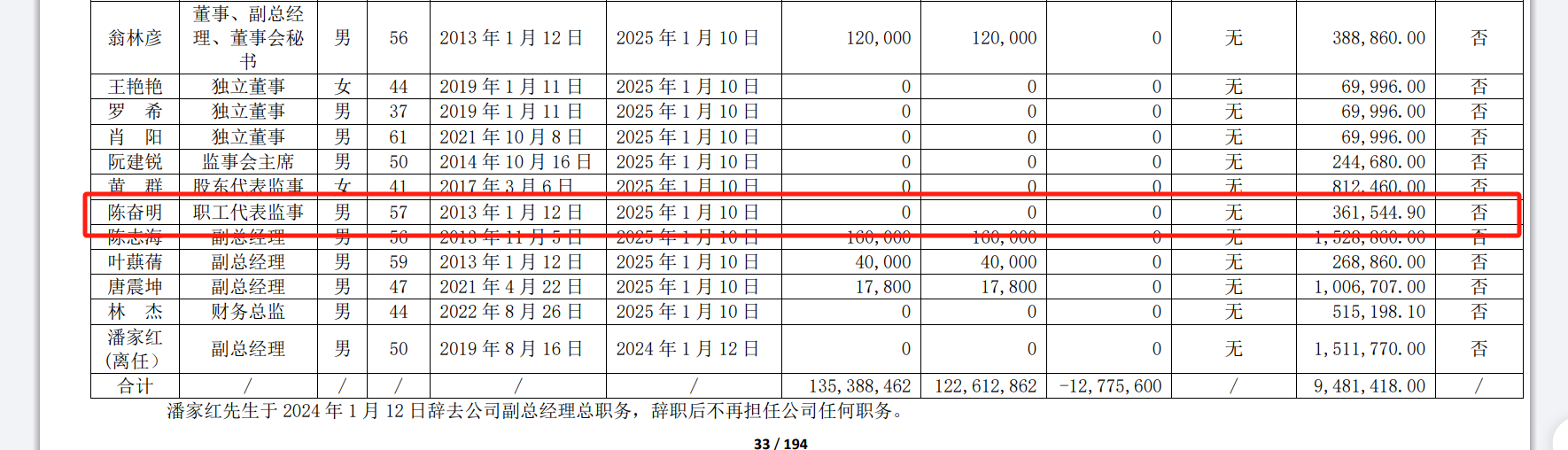 据查阅2023年度报告,陈奋明担任职工代表监事一职,任期起始日期为2013年1月12日,在任时间长达12年。2023年他从公司获得的税前报酬总额为36.2万元。