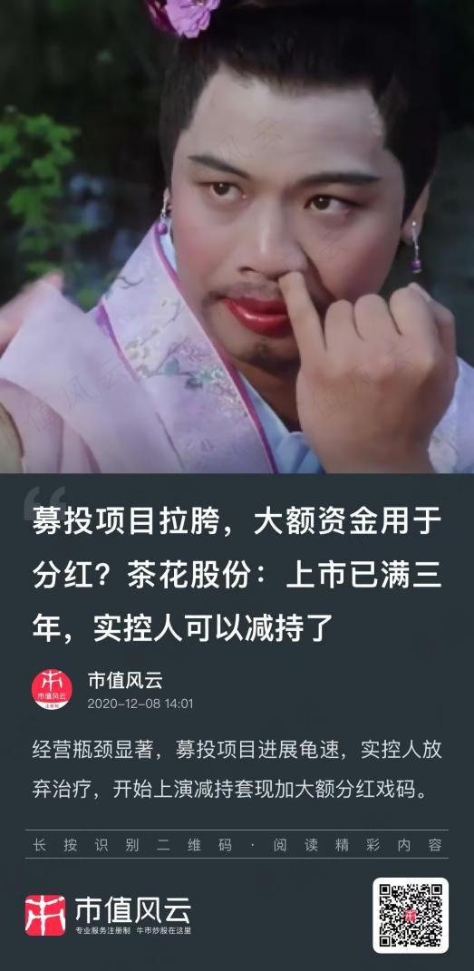 果然如古人所云“勿谓市值风云言之不预”:三年不减持的承诺期刚过,茶花股份就玩起了大额分红和减持套现的把戏。