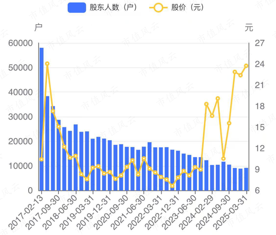 从股东户数来看,上市以来公司股东户数不断减少,筹码不断集中。2023年以来已降至1.5万户以下,截止2025年2月底,股东户数低至不到9000户。