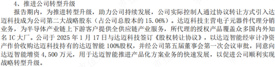 公司称通过协议转让方式引入达迈科技成为公司第二大战略股东,是为推进转型升级,助力公司持续发展。