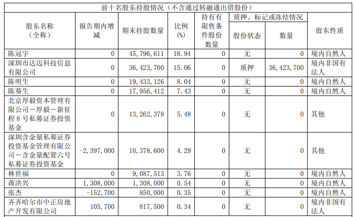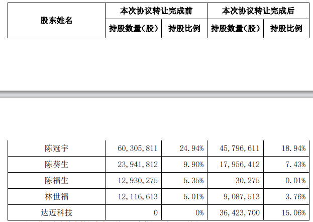 根据公司2024年底发布的公告,公司于2024年12月30日收到实际控制人之一陈冠宇、陈葵生、陈福生、林世福的通知,获悉其协议转让公司部分股份事宜已办理完成过户登记手续。根据此前公告,4人于2024年11月19日与深圳市达迈科技信息有限公司(以下简称“达迈科技”)签署转让协议书,陈冠宇、陈葵生、陈福生、林世福拟分别将所持公司股份 14,509,200 股、5,985,400 股、12,900,000 股、3,029,100 股(合计36,423,700股,占公司总股本的 15.06%)以18.60元/股的价格转让给受让方达迈科技。转让价款合计超6.77亿元。