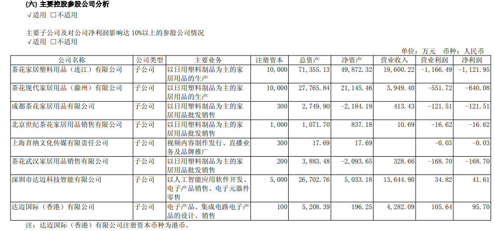 茶花股份一直专注于以日用塑料制品为主的家居用品的研发、生产和销售。公司产品系列齐全,款式丰富,基本涵盖了所有与居家相关的日用产品,形成1000多个单品的产品体系。今年上半年,公司通过全资子公司达迈智能及达迈香港开展电子元器件分销业务,分销的产品主要为存储、射频器件、无线连接等,主要应用于通讯设备、消费电子、汽车电子、工业控制及安防等应用领域。
