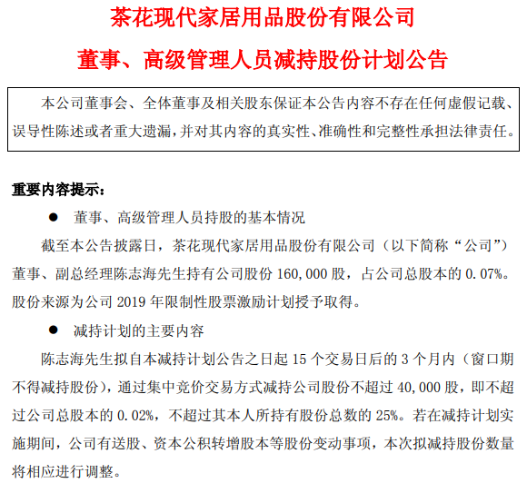 9月16日,茶花股份公告称,公司董事、副总经理陈志海拟自公告之日起15个交易日后的3个月内(2025年10月17日~2026年1月16日),通过集中竞价交易方式减持公司股份不超过4万股,即不超过公司总股本的0.02%,不超过其本人所持有股份总数的25%。