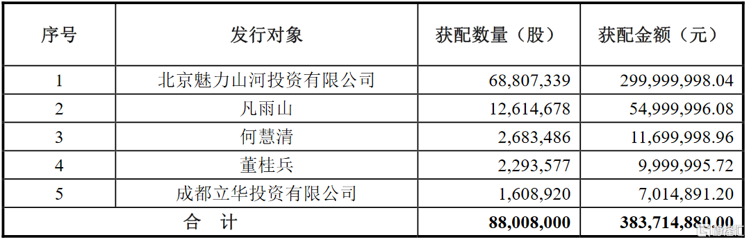 格隆汇8月10日丨韩建河山(603616.SH)发布非公开发行股票发行情况报告书,确定此次发行的价格确定为4.36元/股,发行数量确定为8800.8万股。此次发行的投资者具体获配情况如下: