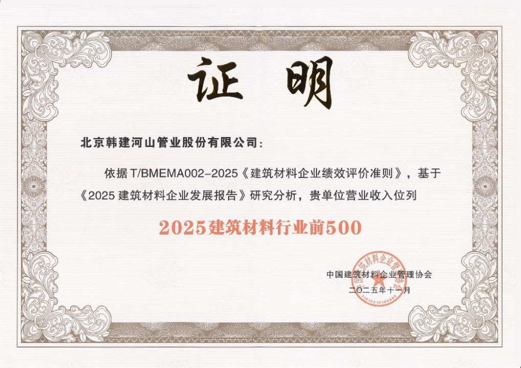 为贯彻党的二十大、二十届三中四中全会精神,引导建材企业深刻把握形势变化,主动应对市场挑战,以积极、务实、有效的管理行动,驱动企业转型升级,营造健康、有序的行业发展格局,11月27日至28日,由 中国建筑材料企业管理协会 主办的“2025建材企业发展大会”在山西省太原市成功举办。会上,北京 韩建河山 管业股份有限公司成功入选“2025建筑材料行业前500”。