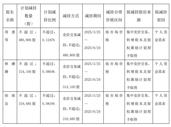 自公告披露之日起15个交易日后的3个月内,周惠琴拟以集中竞价交易方式减持不超过486,806股,占公司总股本的0.1247%,占其持股总数的25%;林姗姗拟以集中竞价交易方式减持不超过314,100股,占公司总股本的0.0804%,占其持股总数的25%;徐海良拟以集中竞价交易方式减持不超过319,685股,占公司总股本的0.0819%,占其持股总数的25%。减持价格按市场价格确定。