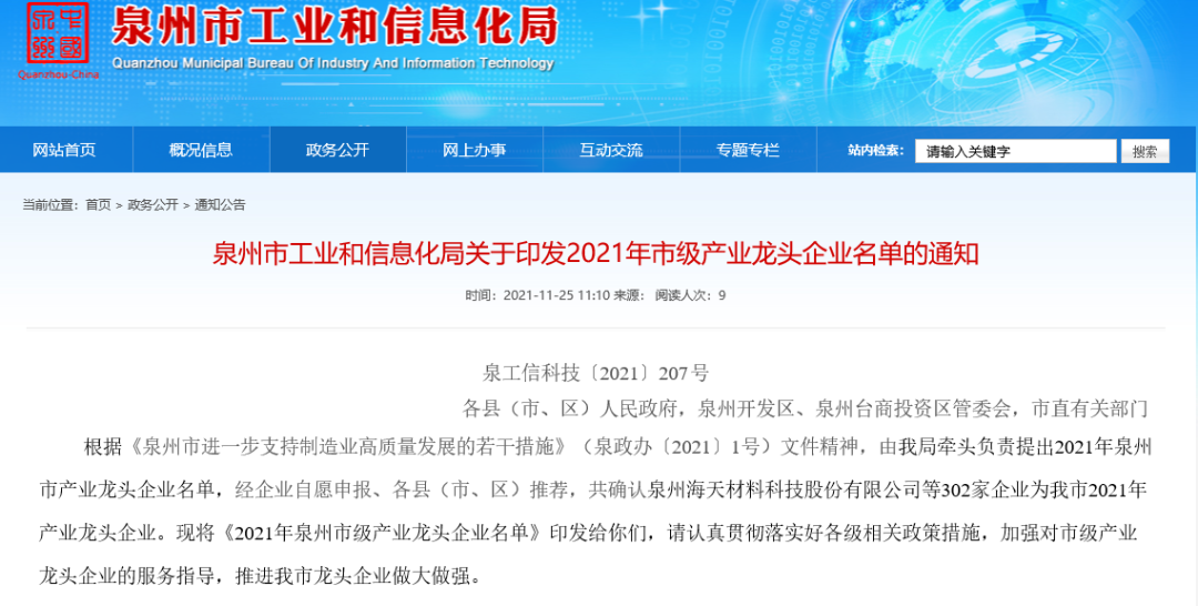11月25日,泉州市工业和信息化局公布了《2021年泉州市级产业龙头企业项目名单》,南威软件凭借在信息产业领域领先的行业地位,荣誉登榜。