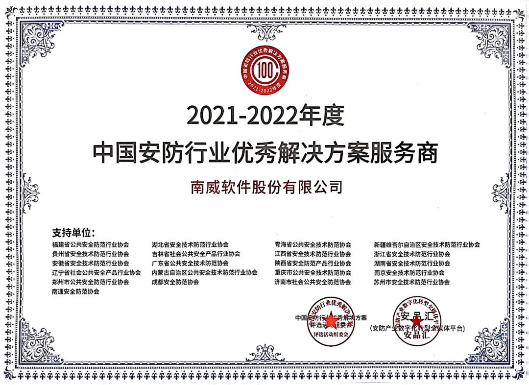 3月24日,由福建省公安厅指导,中国安全防范产品行业协会支持,福建省公共安全防范行业协会主办的第六届中国安防百强工程(集成)商暨第五届中国安防年度人物颁奖盛典在福州海峡国际会展中心举行。会上,南威软件集团凭借殷实的企业实力、过硬的产品及解决方案荣获“第六届中国安防百强工程(集成)商”和“2021-2022年度中国安防行业优秀解决方案服务商”荣誉称号,南威软件集团工程事业群总经理苏温悦获“第五届中国安防年度人物”称号。