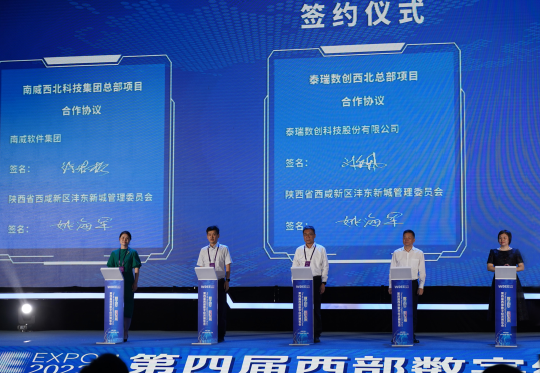 6月16日,南威软件集团董事、总裁徐春梅,集团西北大区业务群总裁冯轲受邀出席西部数博会开幕典礼。随后,陕西省西咸新区沣东新城管理委员会与南威软件集团举行合作协议签约仪式,西安市人民政府市长叶牛平、中国科学院院士徐宗本、工信部信息技术发展司二级巡视员王少朋、陕西省政务大数据服务中心主任赵孝、省工信厅厅长陈忠、西安市人民政府副市长孟浩、西咸新区党工委书记杨仁华等领导出席见签,徐春梅总裁代表南威软件集团与陕西省西咸新区沣东新城管理委员会签署南威西北科技集团总部项目落地协议,共同打造西北区域具有一定市场影响力的信息化科技集团,助力西北发展迈向新辉煌。