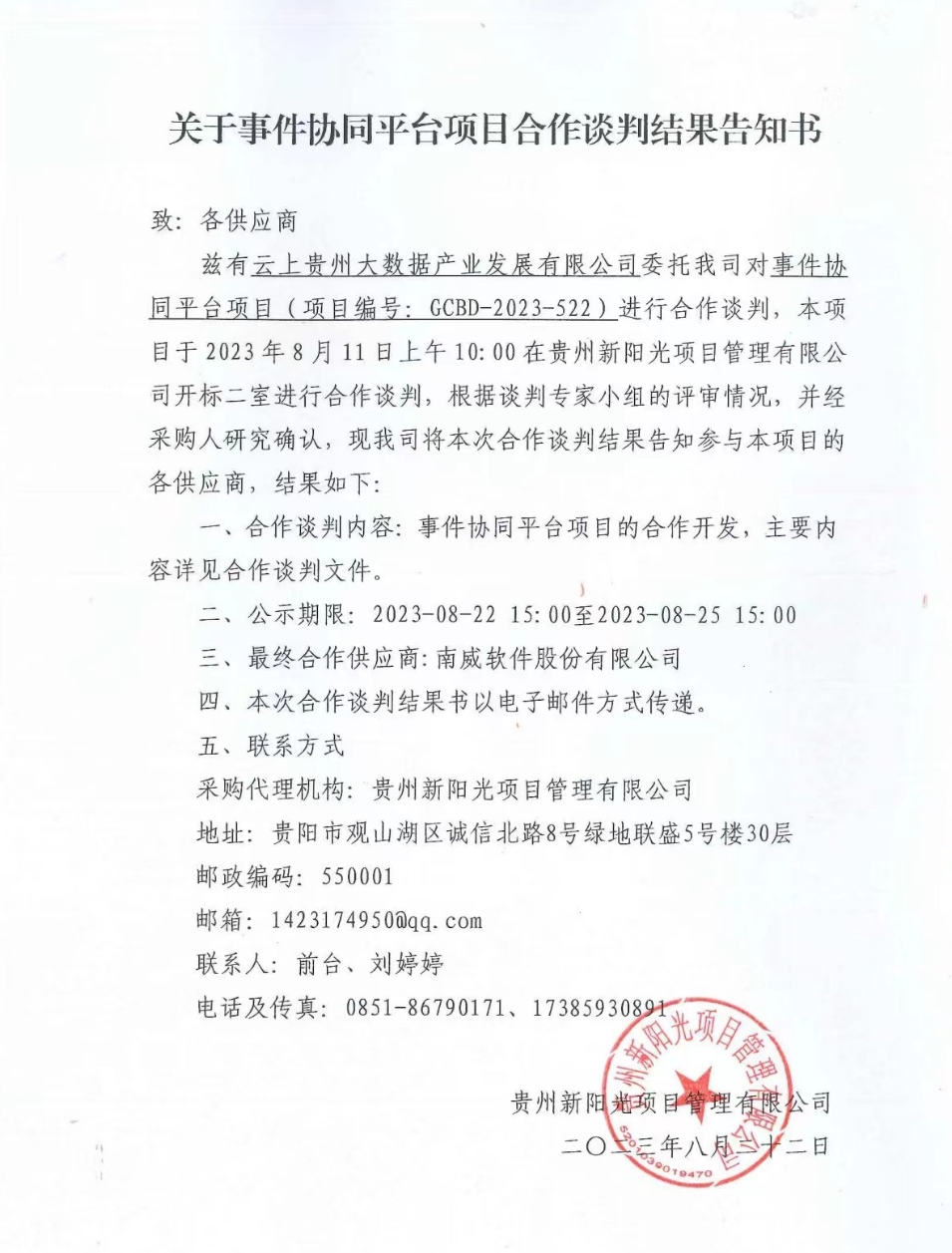 近日,贵州新阳光项目管理有限公司发布《关于事项协同平台项目合作谈判结果告知书》,确认南威软件股份有限公司(以下简称“南威软件”)为最终合作供应商,南威软件凭借过硬的技术、丰富的经验、优质的服务和良好的信誉赢得市场的肯定,中标该项目。
