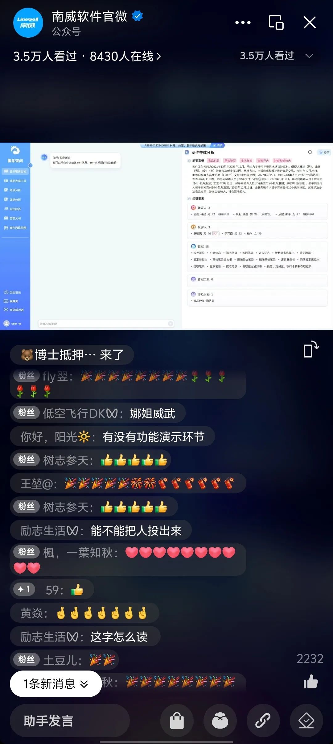 3月14日,南威软件獬豸智阅一体机产品发布会,通过网络直播的方式召开,累计吸引了行业内外5万余人观看。会上,南威软件重磅推出两款獬豸智阅一体机,该系列产品基于南威通用DeepSeek+智能体模型,结合检察官实际办案需求和工作习惯,精准打造卷宗整体分析、证据分析、笔录分析、办案时间轴、人物关系图谱、智能文书等功能,助力检察官高质效办好每一个案件。