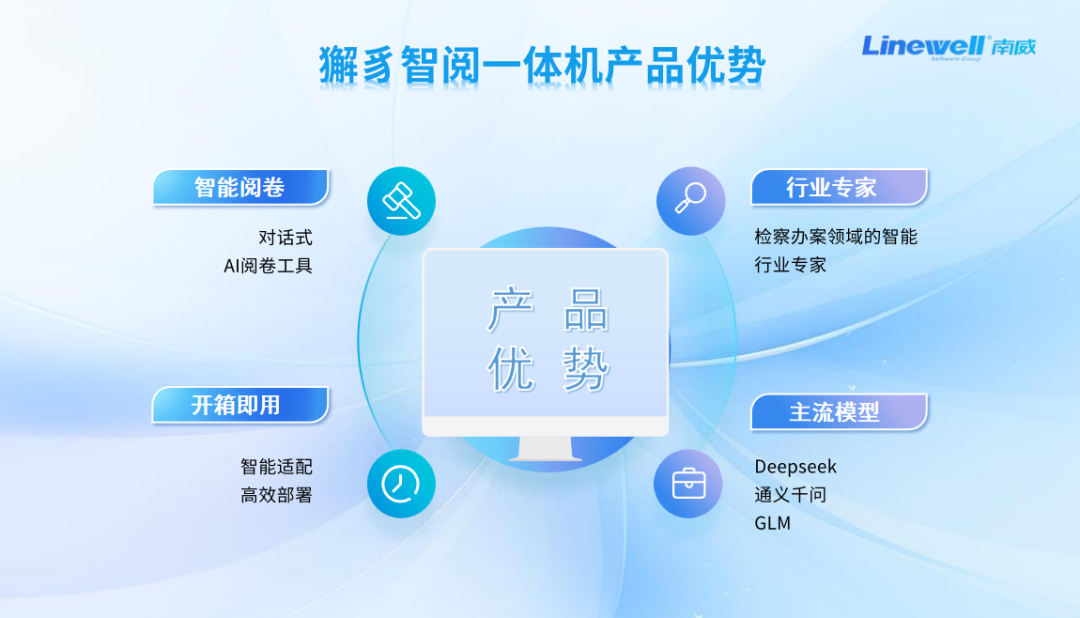 南威软件獬豸智阅一体机,依托领先大模型技术栈,融合多模态技术,提升模型能力。专为检察院定制,贴合办案习惯,优化输出,缩短办案周期,保障案件质量。内置三百多常见问题,助力新手成长。深度适配阅卷场景,单台运行大模型,软硬件融合,部署便捷,革新阅卷体验。