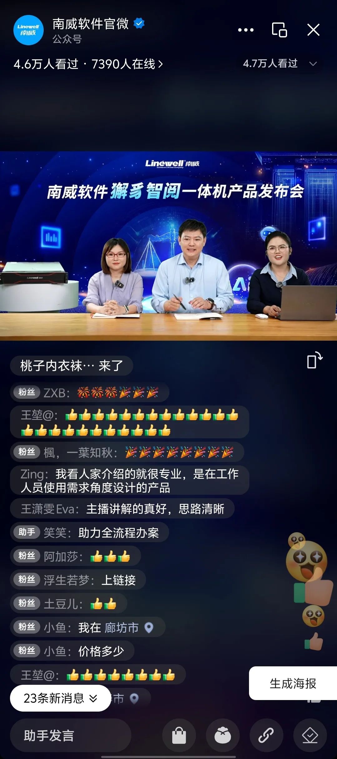 本场发布会由南威软件集团南信信息副总经理陈建、陈秋娜,研发中心副总经理王冬梅担任现场主播,向观众详尽介绍了产品的性能与优势,并通过线上问答互动,即时解答观众疑问,带领观众感受南威技术硬核实力。
