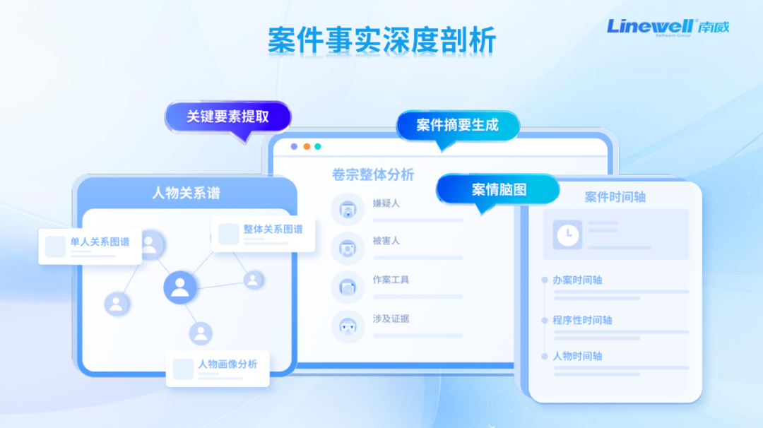 产品聚焦案由、时间、人物三要,提供卷宗整体分析、案件时间轴、人物关系图谱等功能。
