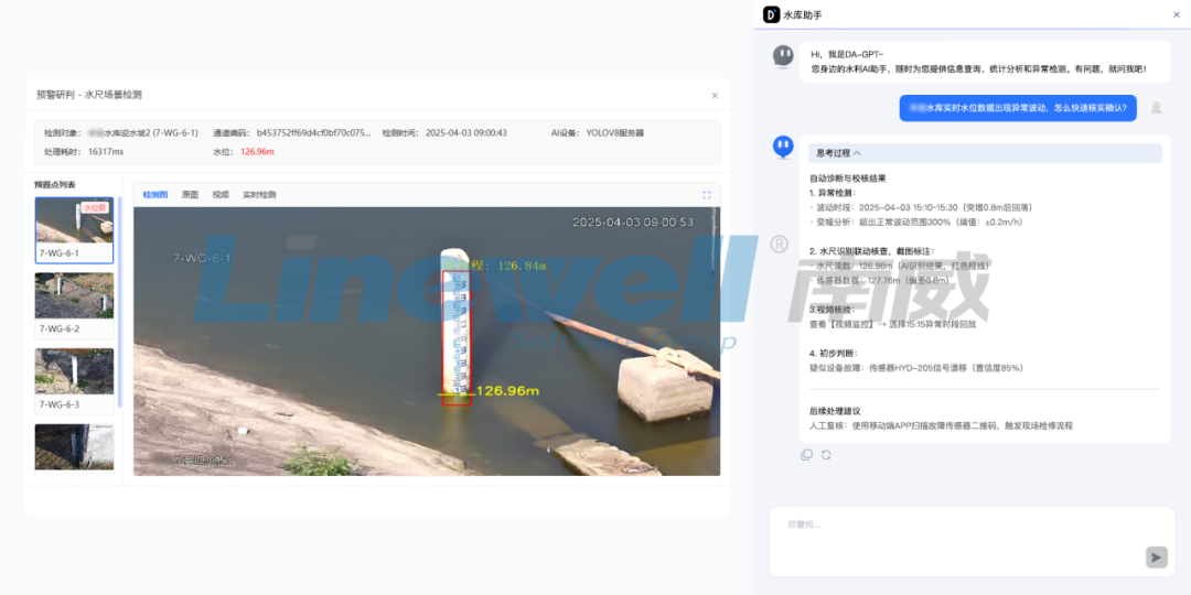 联动水库的视频监控和智能识别算法,实现水位异常波动的校核操作,并结合机器算法分析监测数据的变幅情况,以辅助判断是否存在设备故障,并可联动运维工单实现运维工作闭环。