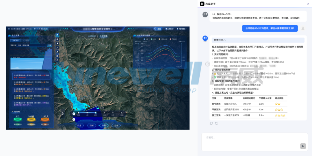 结合实时监测数据,自动联动水利知识平台和水利专业模型实现对水位上涨变化以及下游区域影响的分析和模拟预演,并提供相应的不同开闸调度方案,进行比对分析,助力防汛指挥决策。