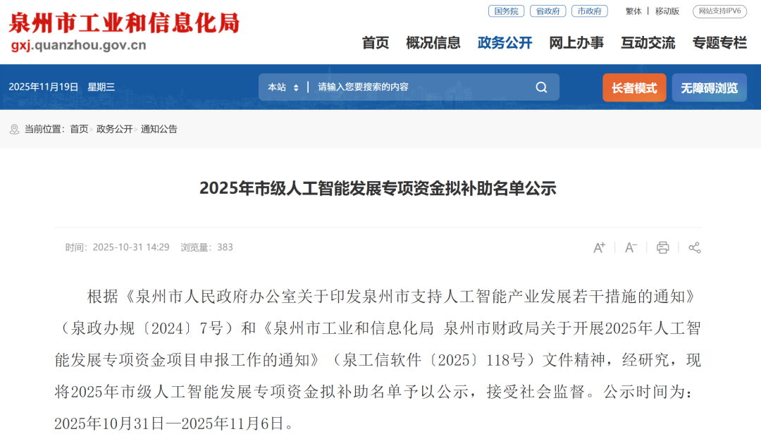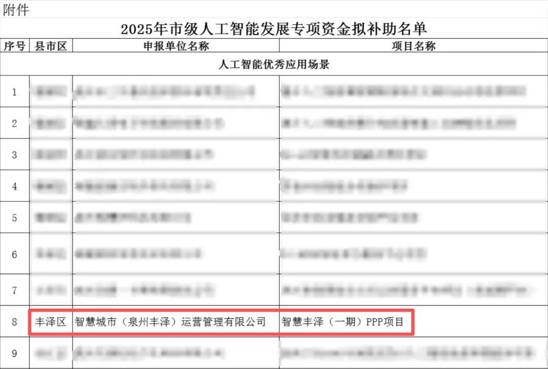 近日, 泉州市工业和信息化局 正式公布2025年市级人工智能发展专项表彰名单, 南威软件 智慧城市(泉州丰泽)运营管理有限公司承建的“智慧丰泽(一期)PPP项目”凭借在人工智能应用领域的创新成果,获评“人工智能优秀应用场景”称号,荣获市级专项表彰。