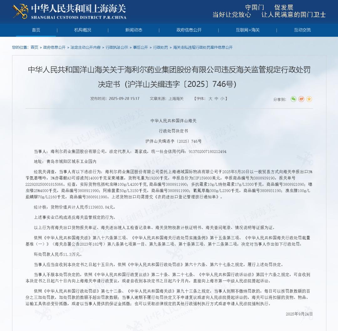 近日,中华人民共和国洋山海关发布关于海利尔药业集团股份有限公司违反海关监管规定行政处罚决定书(沪洋山关缉违字〔2025〕746号)。