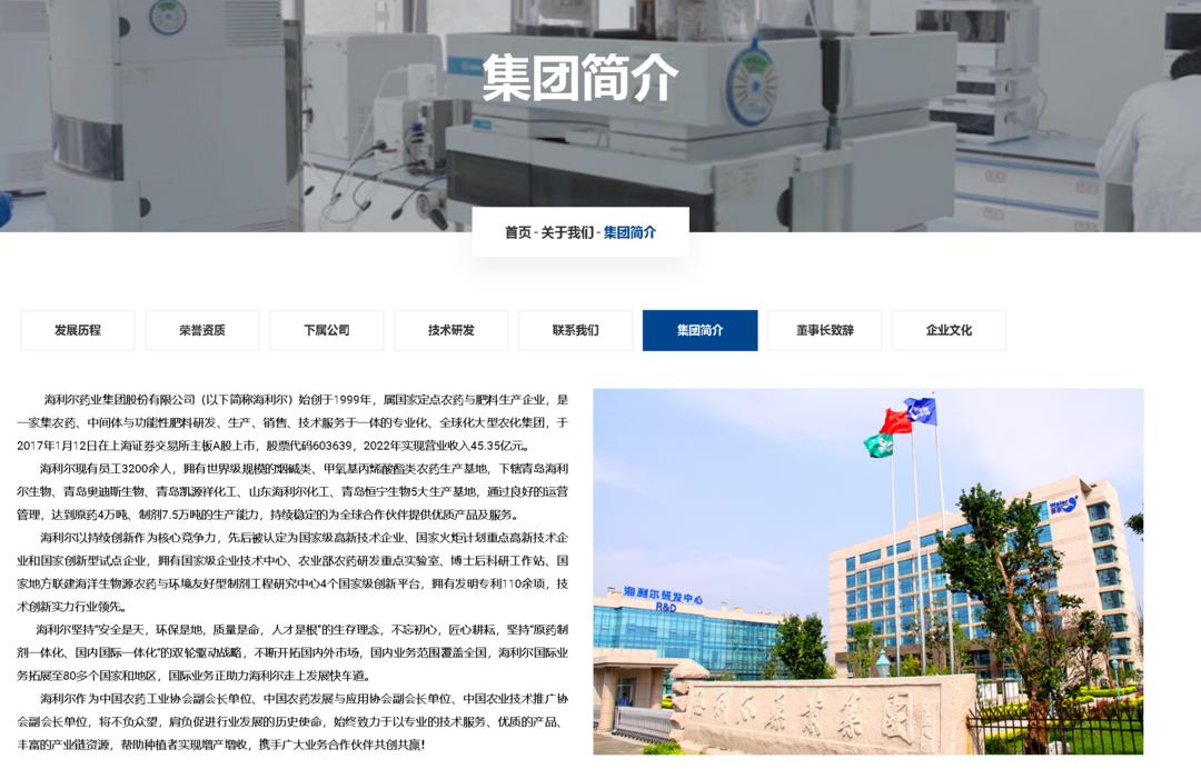 海利尔药业集团股份有限公司(以下简称海利尔)始创于1999年,属国家定点农药与肥料生产企业,是一家集农药、中间体与功能性肥料研发、生产、销售、技术服务于一体的专业化、全球化大型农化集团,于2017年1月12日在上海证券交易所主板A股上市,股票代码603639,2022年实现营业收入45.35亿元。
